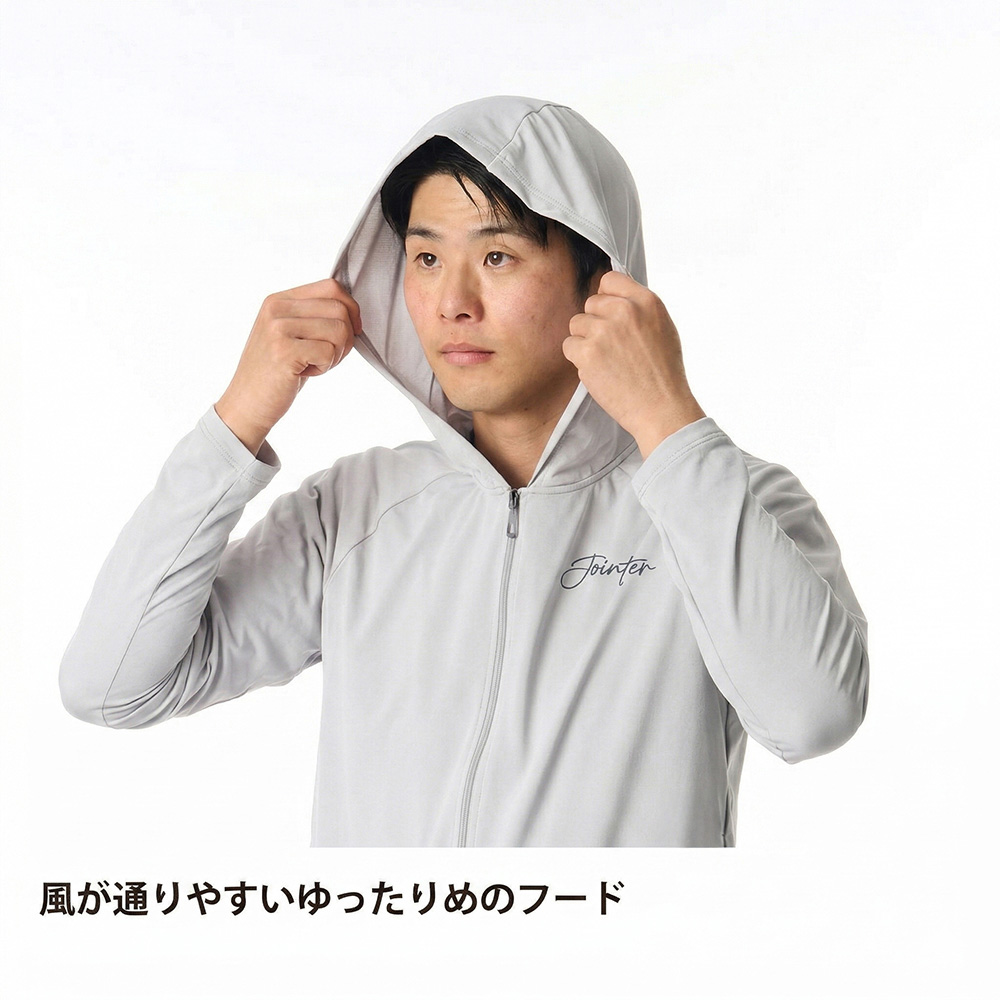 - ●やや長めの袖丈/フードで頭部・首元まで日射しを遮る
