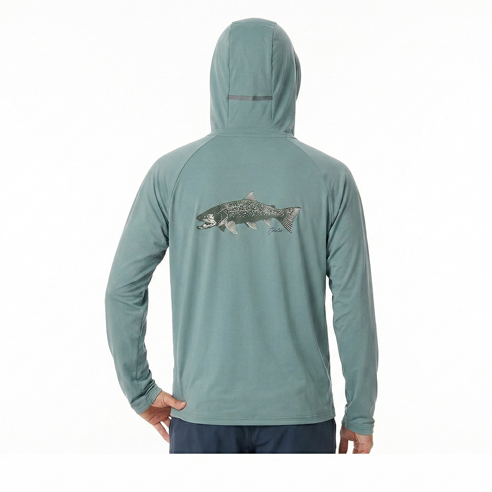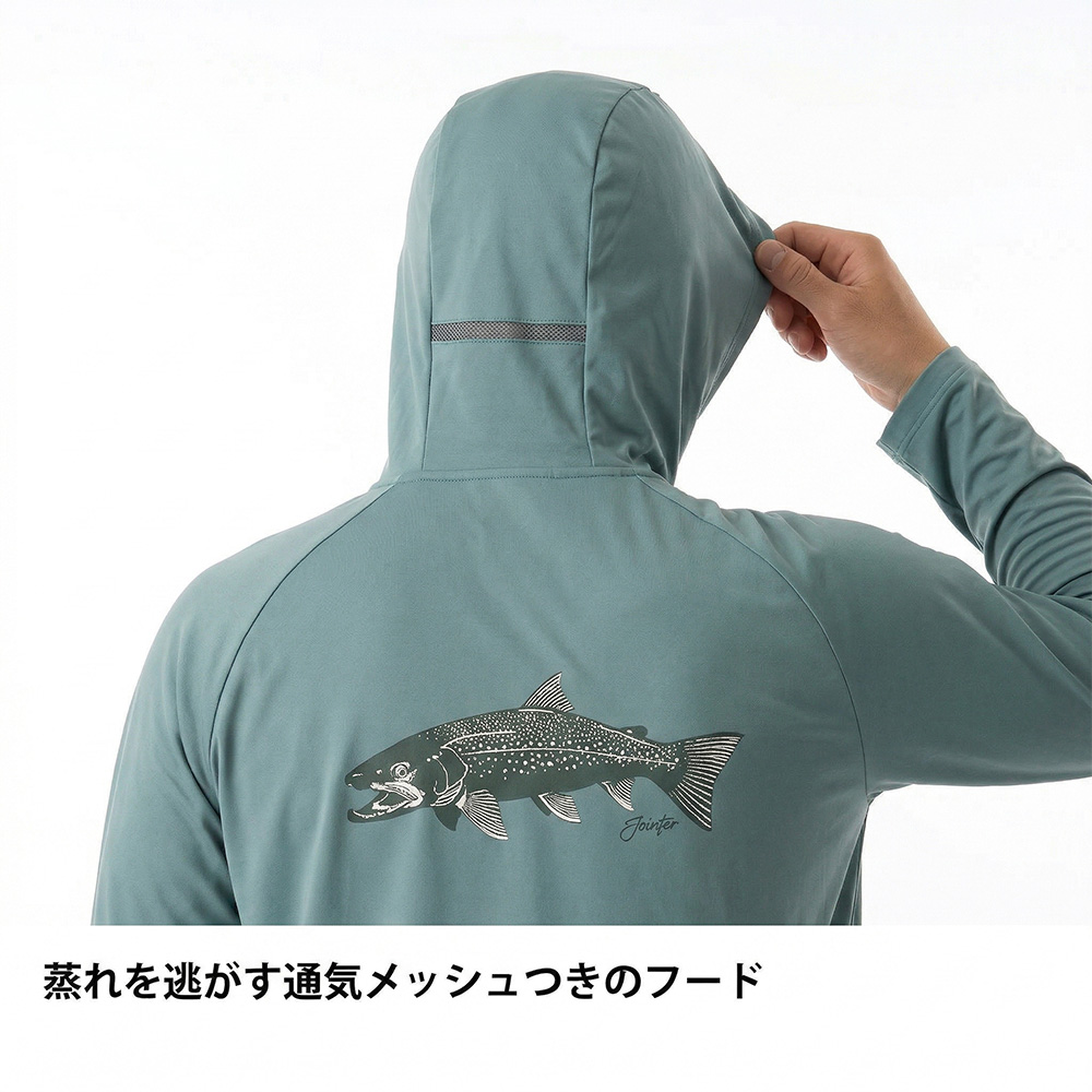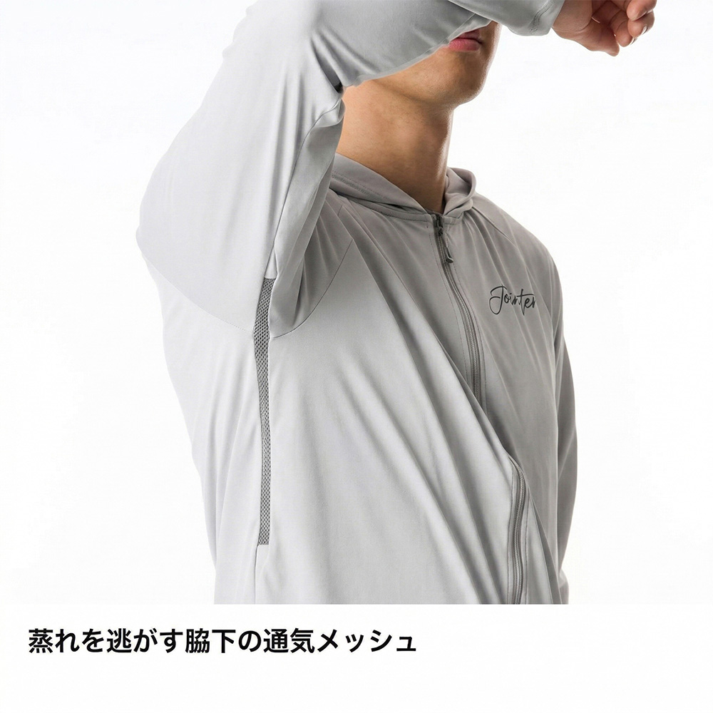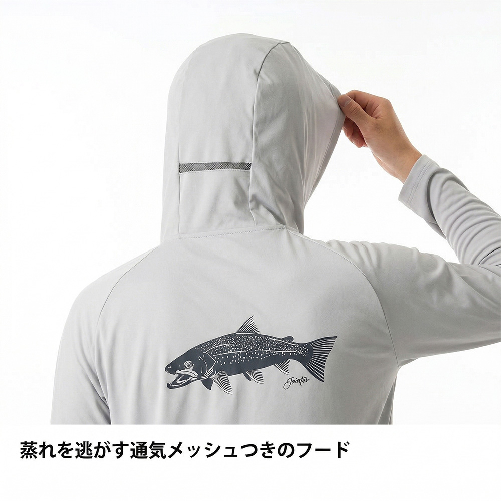 太陽熱の影響を抑える遮熱と、汗を素早く乾かす吸汗速乾を、生地設計で両立させたフーデッドベースレイヤー。
