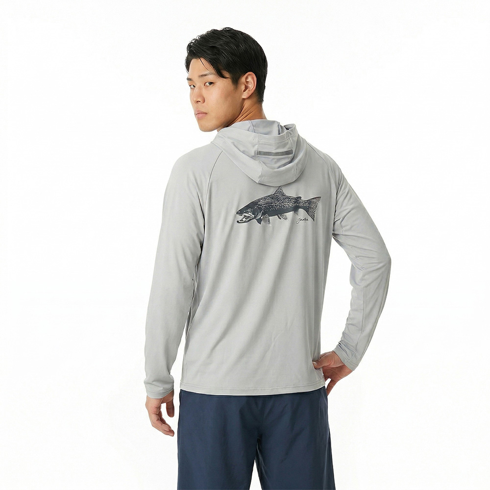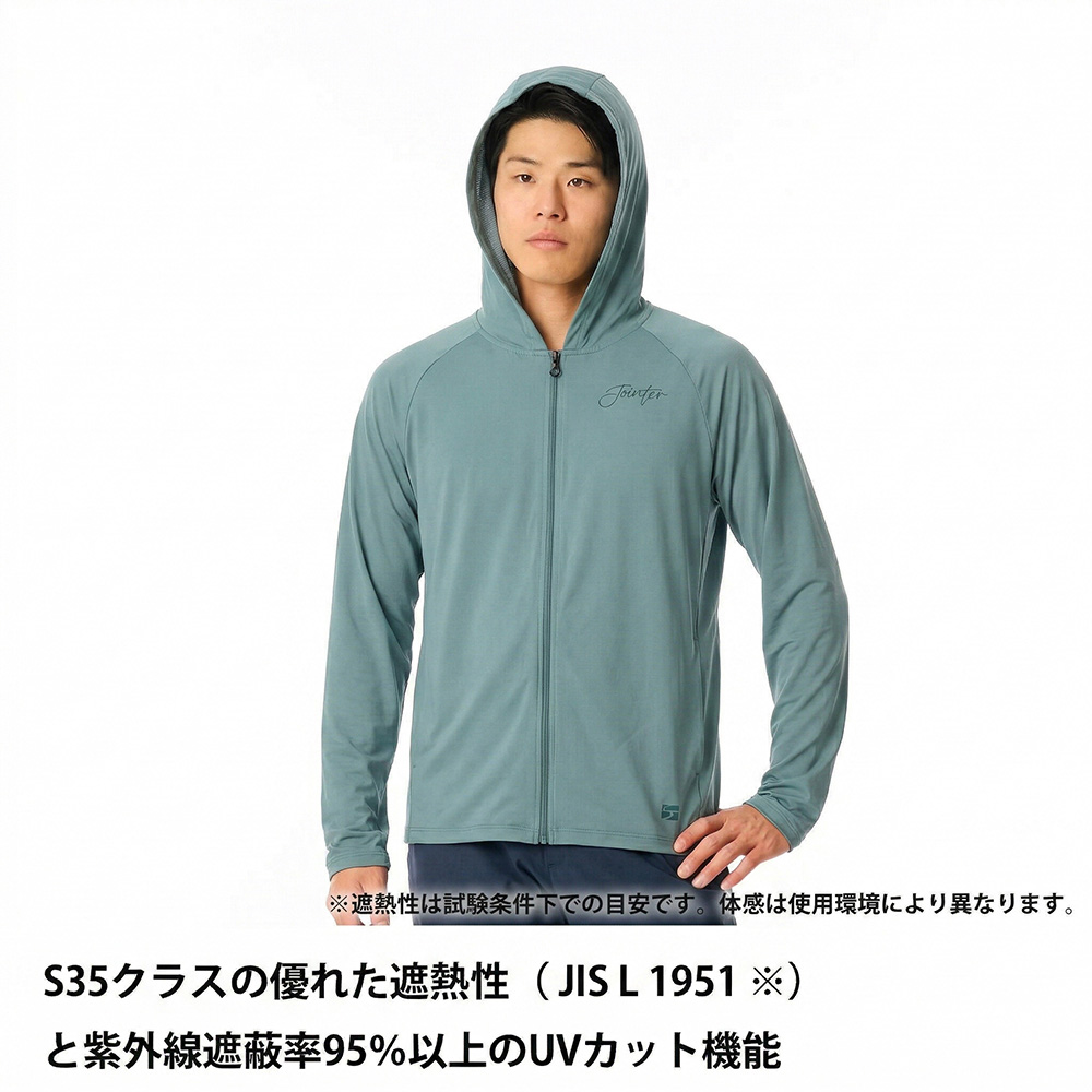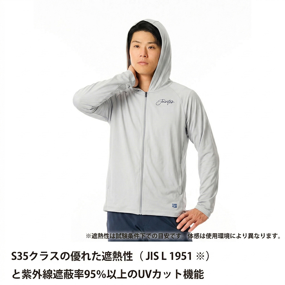 太陽熱の影響を抑える遮熱と、汗を素早く乾かす吸汗速乾を、生地設計で両立させたフーデッドベースレイヤー。
