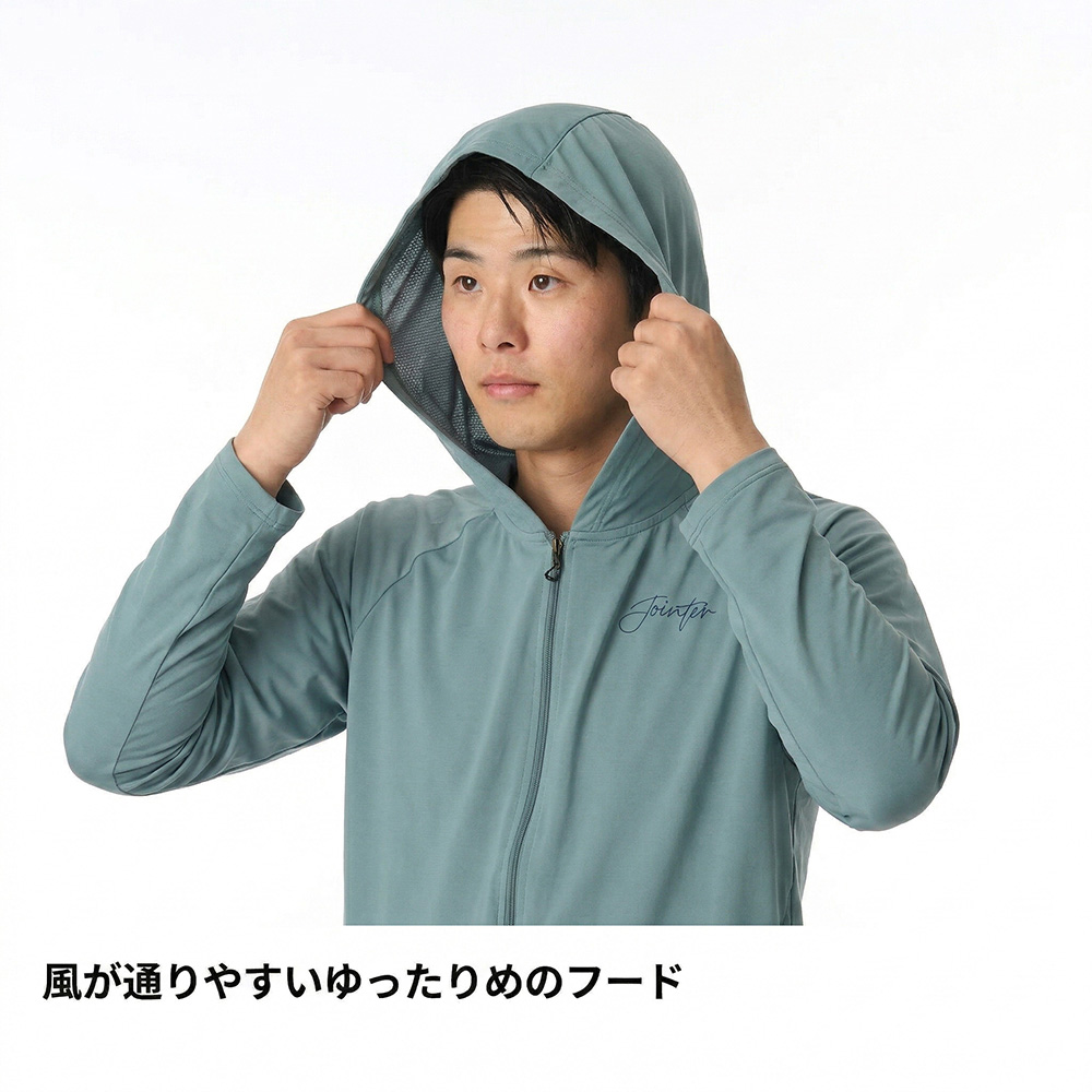 - ●やや長めの袖丈/フードで頭部・首元まで日射しを遮る