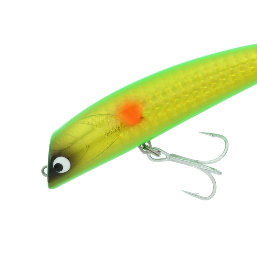 ボディ側面はシルバーよりも濁り水の中でアピールしやすいゴールド(レンズゴールド)を両面に配置し、バック&ベリーは最近釣れると評判のライムグリーンを配置しました。